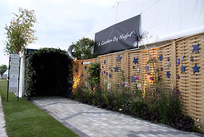 The entrance to the marquee features stars painted by pupils at Wood Green School; an oversized glass flower by Neil Wilkin; archway by Tramway Forge planted with scented honeysuckle and Tracelospermumjasminoides from Earlswood Plants.